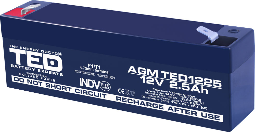 Acumulator AGMVRLA 12V 2.5Ah plumb acid 178x34x60 mm F1 TED Battery Expert Holland AGM TED1225F1 12V 2.5Ah F1 terminal TED003096.