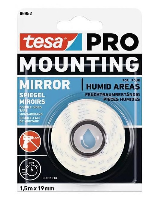 Banda tesa PRO Montaj Oglinzi este ideală pentru meseriaşi în cazul în care clienţii nu doresc găurirea suprafețelor. Banda dublu adezivă oferă o fixare fiabilă chiar şi în medii cu umiditate crescută. Banda durabilă se lipeşte de suprafeţe netede, cum ar fi plăci ceramice şi susţine obiecte plate cu o grosime de până la 4 mm, cum ar fi oglinzi. Cu această bandă dublu-adezivă în trusa de scule sunteţi gata să îndepliniţi toate nevoile de fixare la interior pe care le poate avea un client.