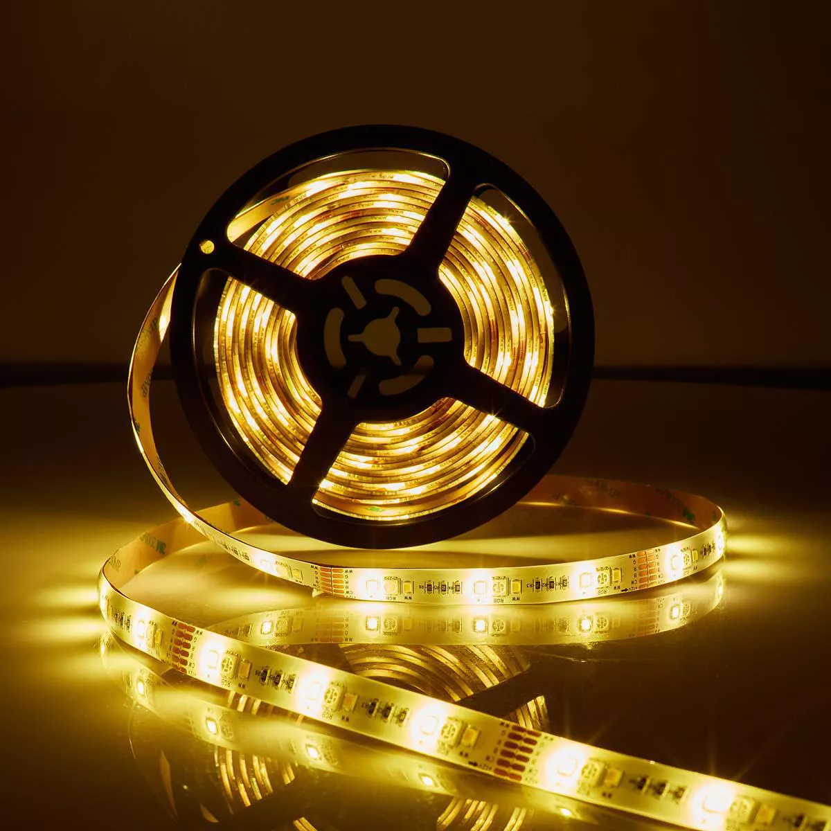 Deoarece această bandă LED combină atât LED-uri RGB, cât și LED-uri albe calde și reci, nu numai că puteți seta orice culoare preferată, dar o puteți folosi și pentru iluminarea indirectă albă caldă până la rece Lungimea sa de 5 metri poate fi scurtată sau extinsă cu benzi LED similare pentru posibilități nelimitate.