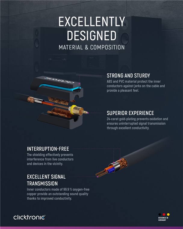 Cablu audio Clicktronic cu ecranare dublă din folie de aluminiu și împletitură de cupru pentru o calitate strălucitoare a semnalului