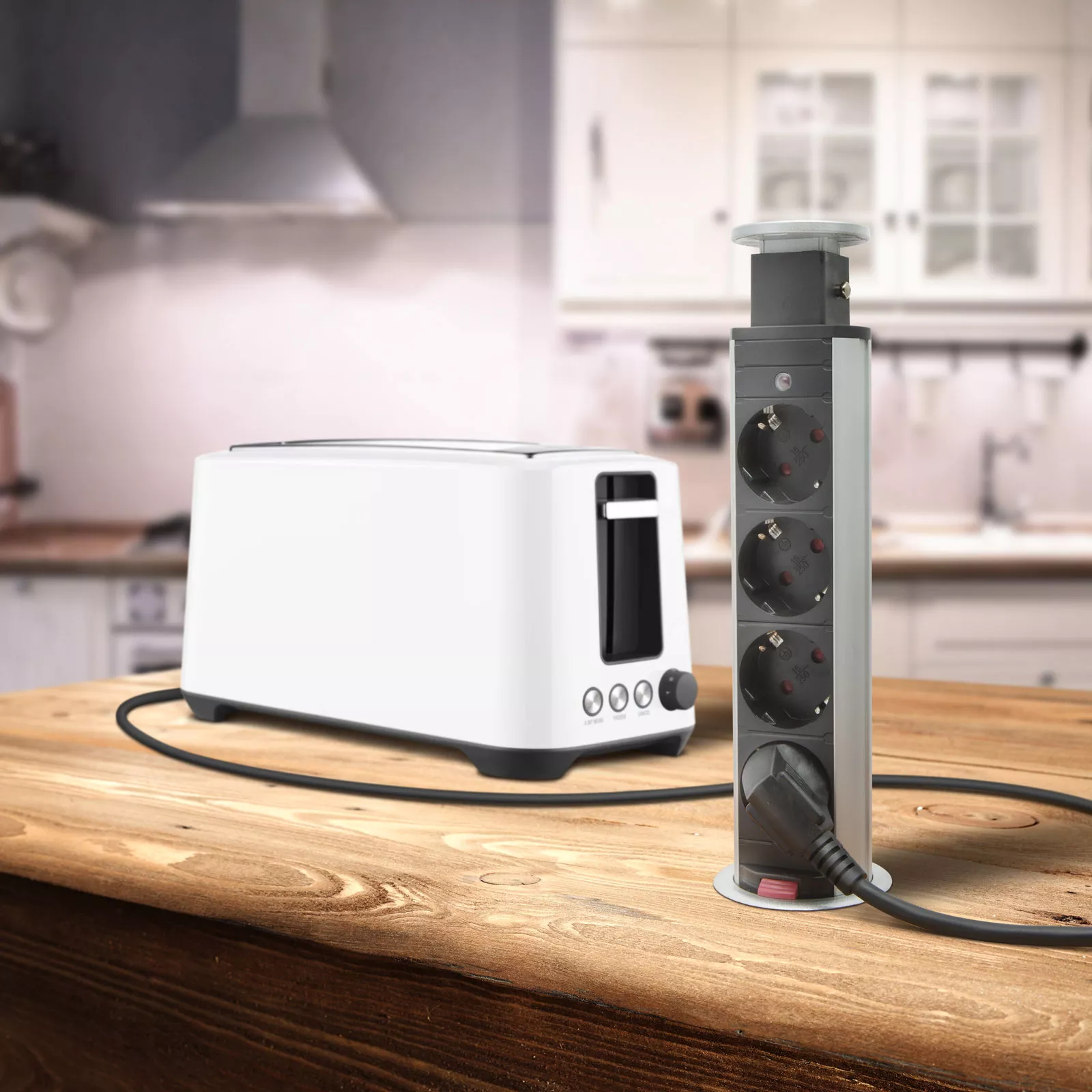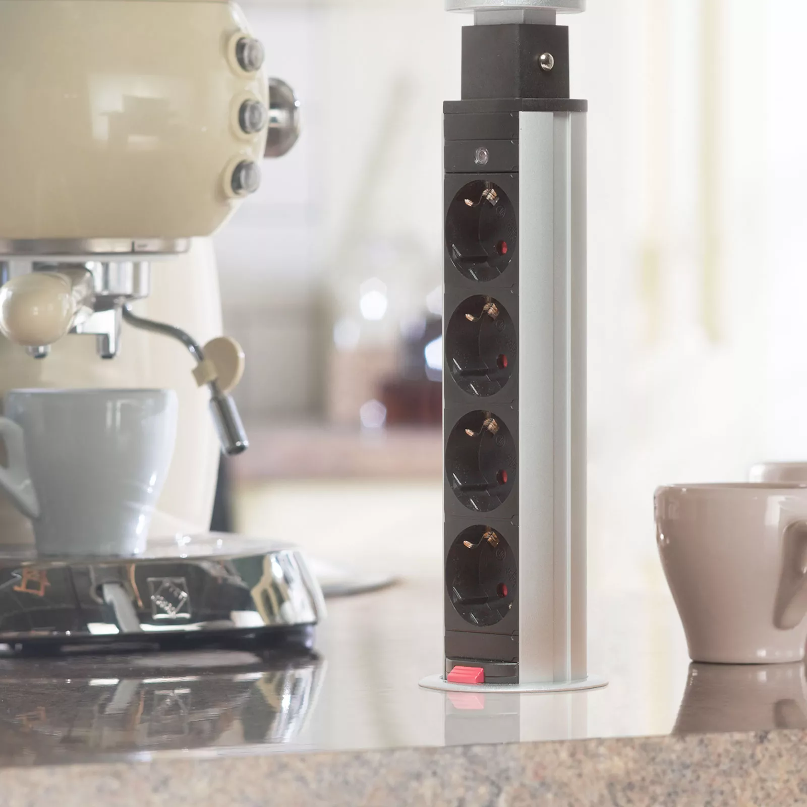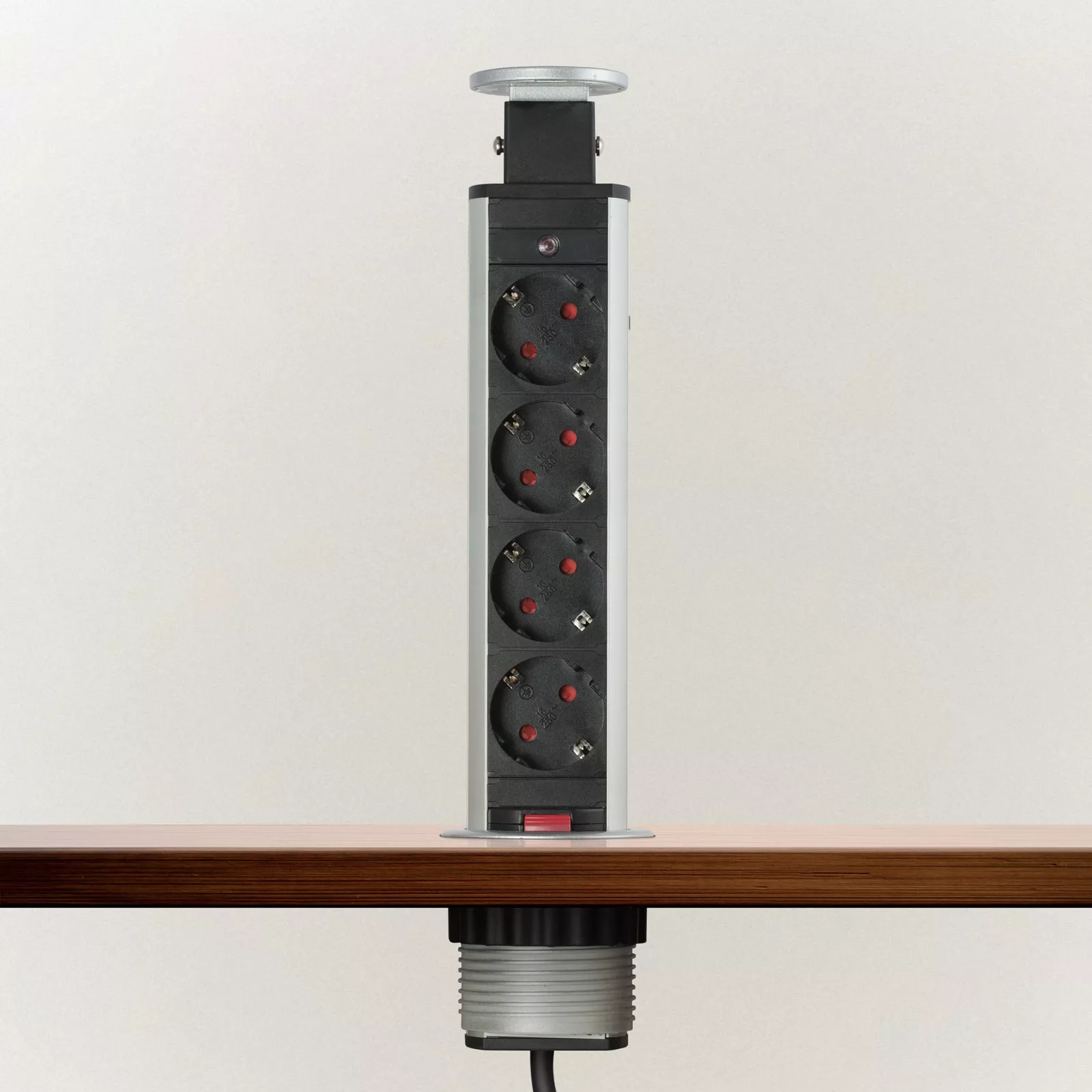 Pentru un birou sau mobilier mereu elegant şi ordonat, dar şi funcţional totodată. Distribuitorul camuflat este soluţia ideală şi pt. o bucătărie deja terminată, dar fără prize suficiente, montate la locul potrivit – deoarece dintr-o mişcare dispuneţi de prize libere.