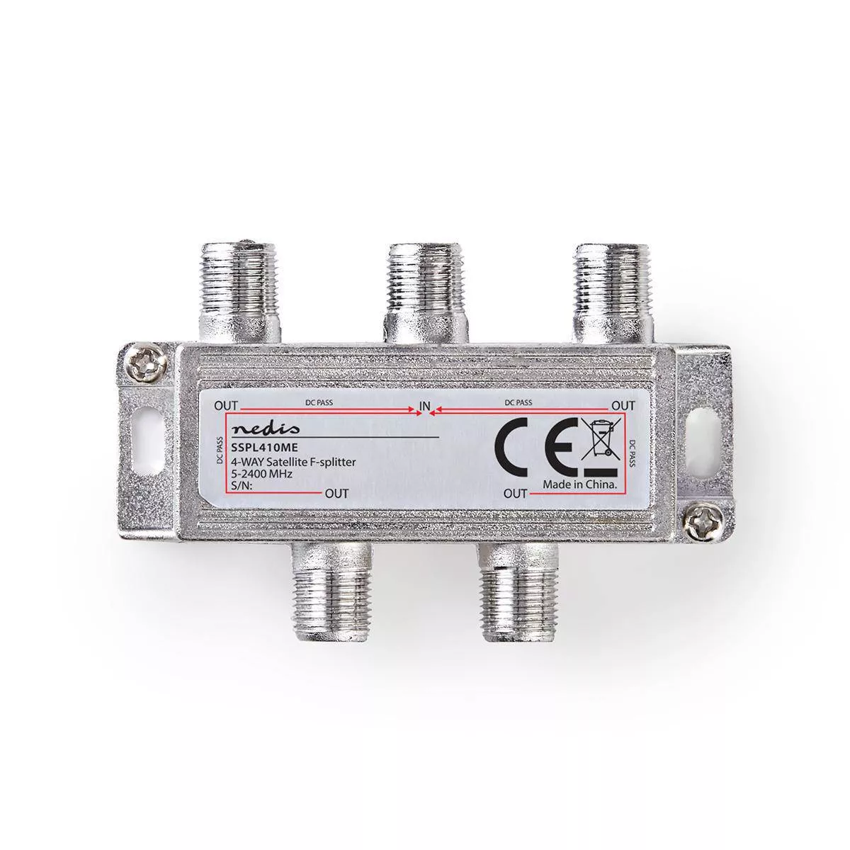 Splitter cu 4 căi într-o carcasă turnată sub formă de zinc, cu pas de alimentare prin satelit și cu conectori F pentru a împărți un semnal de satelit.