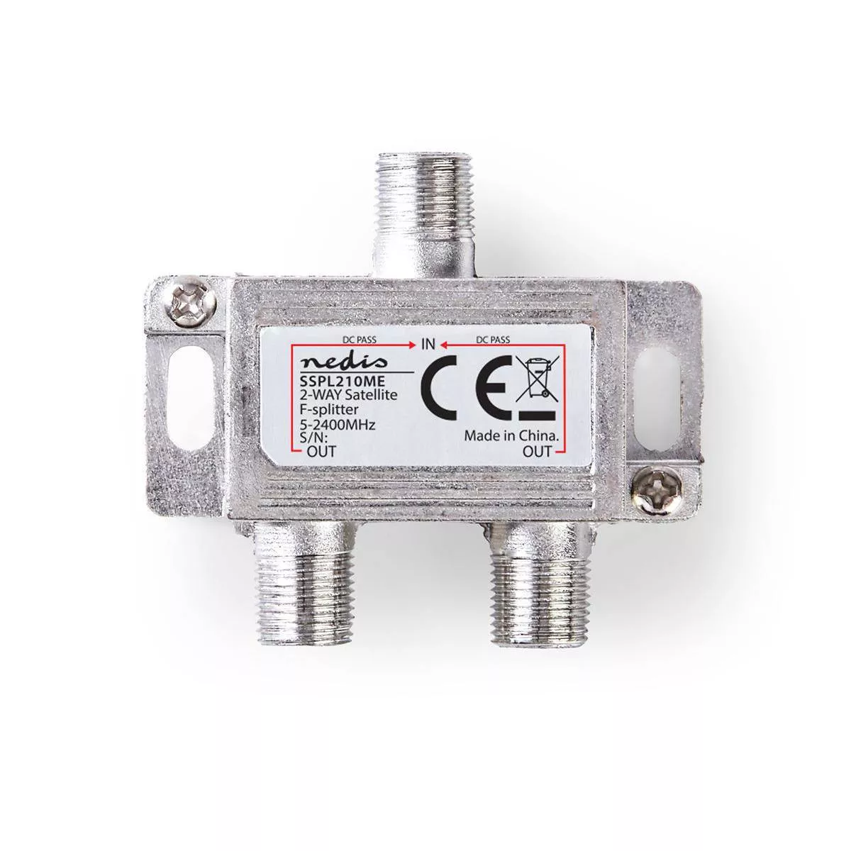 Splitter cu 2 căi într-o carcasă turnată sub formă de zinc, cu trecere prin satelit și cu conectori F pentru a împărți un semnal satelit.