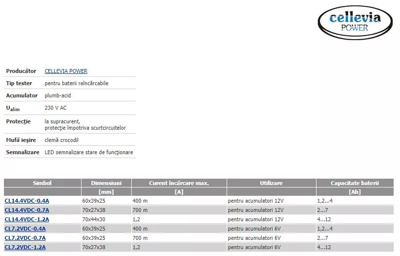 Incarcator baterii reincarcabile plumb-acid 12V 700mA 2-7Ah CELLEVIA POWER CL14.4VDC-0.7A.