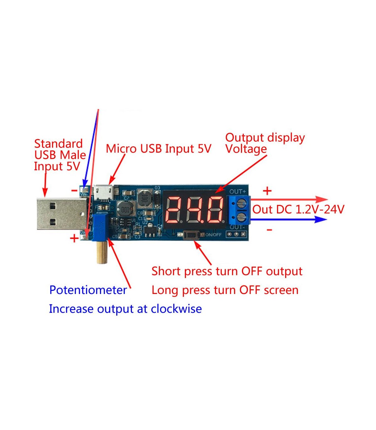 Modulul de alimentare USB boost / buck, alimentat de USB, reglați potențiometrul pentru a obține tensiunea necesară.