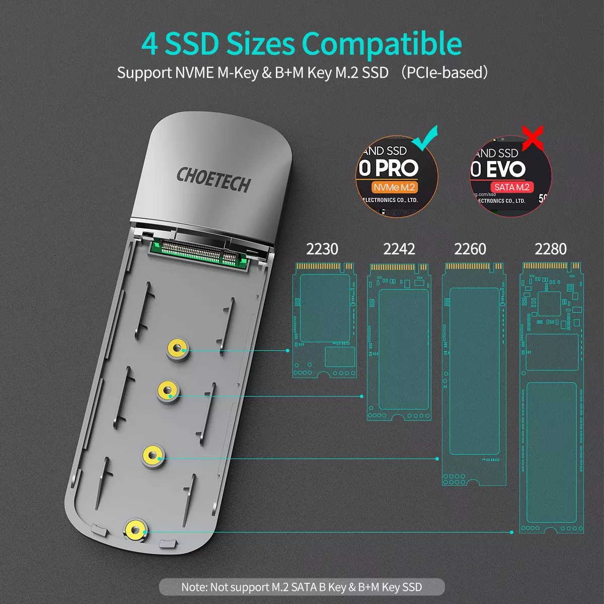 Carcasă PC-HDE16 CHOETECH M.2 NVMe SSD, USB 3.1 Gen 2 [10Gbps] La NVME PCI-E M-Key SSD Solid SSD Carcasă Externă Adaptor Suport M.2 NVMe SSD 2280 2260 2242 2230