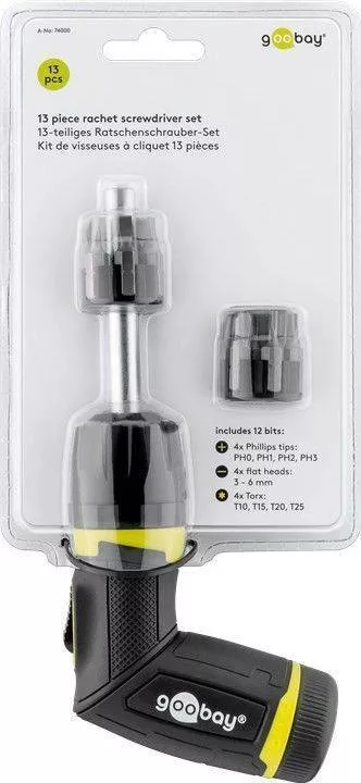 Set surubelnita cu clichet 12biti CrV 4x Phillips PH0 PH1 PH2 PH3 Capete plane 4x 3mm 4mm 5mm 6mm 4x Torx T10 T15 T20 T25 Goobay